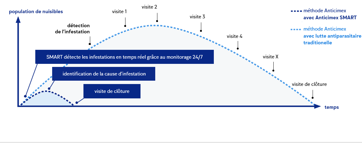 La méthode Anticimex permet des interventions parfaitement synchronisées dans le temps. Cela réduit progressivement l'ampleur et la fréquence des infestations. La grande quantité de données en temps réel générées par nos systèmes de surveillance numérique permet de prendre des décisions éclairées et fondées sur les données. Les tendances historiques, les conditions actuelles et les risques sont immédiatement disponibles, facilitant ainsi une approche stratégique de la gestion des nuisibles.