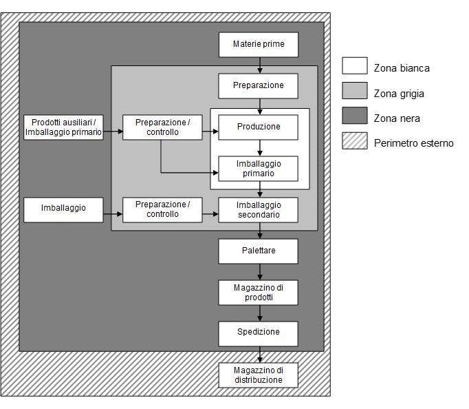 Una delle misure preventive più importanti è la suddivisione dell'impianto di produzione in zone di igiene e pulizia, per cui il grado di pulizia aumenta dall'esterno verso l'interno. Tale piano di zona è mostrato nella "Figura Concetto di zona".