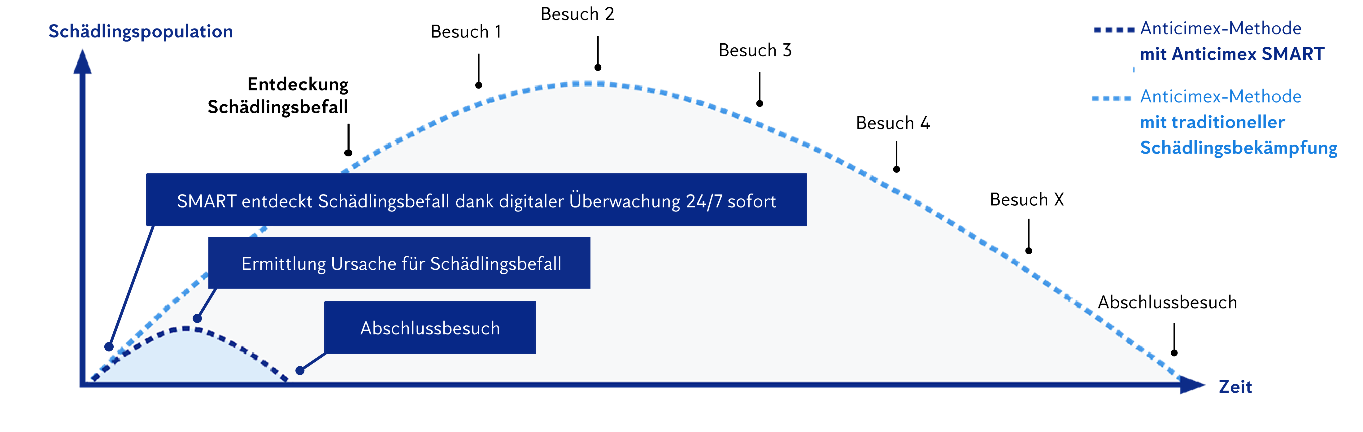 Die Anticimex-Methode ermöglicht so zeitlich perfekt abgestimmte Interventionen. Mit der Zeit führt dies zu immer weniger und kleineren Schädlingsbefällen. Die grosse Menge an Echtzeitdaten, die durch unsere digitalen Überwachungssysteme generiert werden, ermöglicht fundierte, datengestützte Entscheidungen. Historische Trends, aktuelle Bedingungen und potenzielle Risiken sind sofort verfügbar, was einen strategischen Ansatz für das Schädlingsmanagement erleichtert.