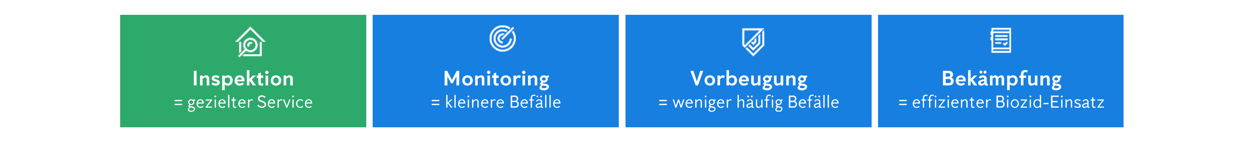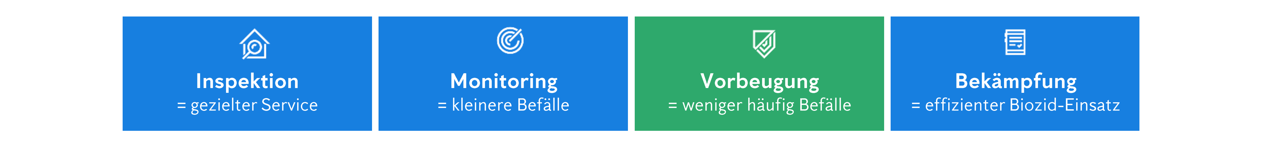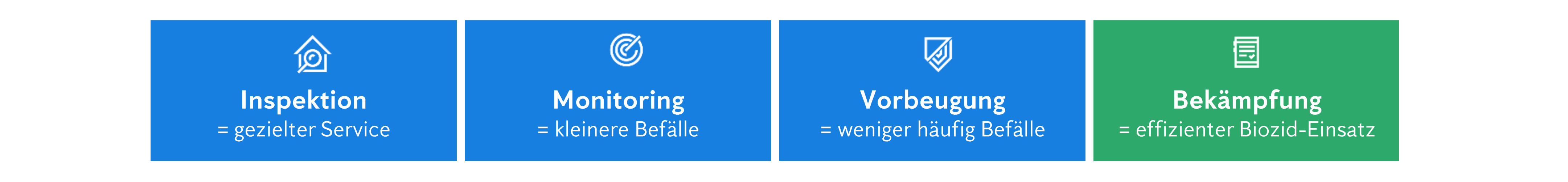 Unsere Methode der Schädlingsbekämpfung ist mehr als eine einmalige Intervention auf einen akuten Schädlingsbefall. Vielmehr basiert sie auf der Vision, Schädlinge durch vorbeugende und kontinuierliche Massnahmen nachhaltig in Schach zu halten und so ihr Vorkommen mit möglichst wenigen Eingriffen und mit möglichst geringem Einsatz toxischer Wirkstoffe zu kontrollieren.